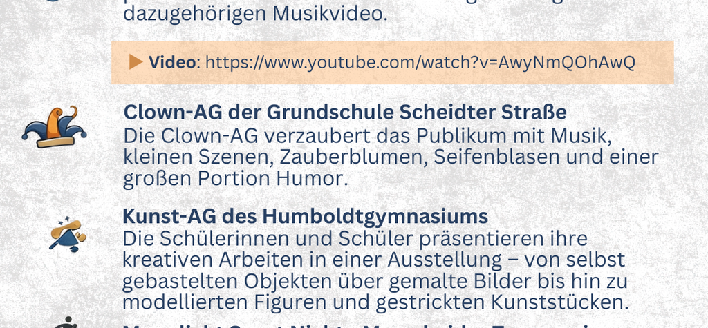 Wer Zeit und Lust hat, kann sich gegen 12:45 Uhr den Auftritt unserer Dritt- und Viertklässler sowie die Präsentation des Viedos anschauen.